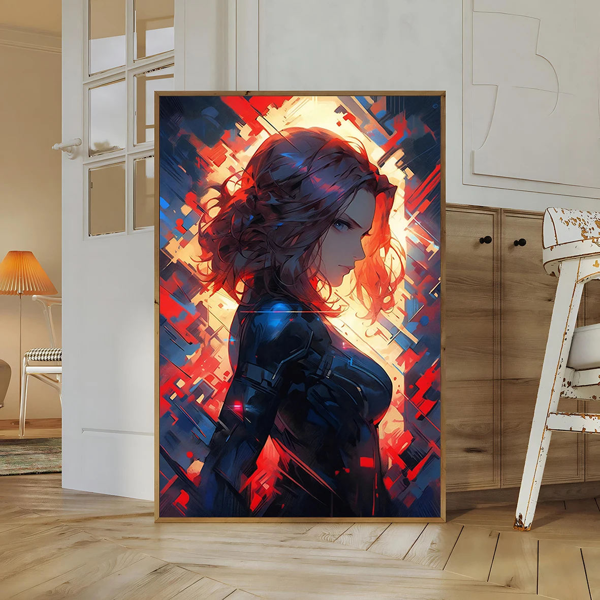 This artwork is a masterclass in visual storytelling. The artist uses a chaotic, abstract background of fragmented reds, blues, and golds to symbolize the fractured past and the high-tech world of espionage that Natasha Romanoff navigated. Her profile is rendered with a quiet intensity, her gaze fixed and determined, capturing the calculated resolve of a super-spy who is always ten steps ahead. The dramatic backlighting creates a powerful silhouette, highlighting her iconic red hair, which seems to burn with an inner fire against the cool, dark tones of her tactical suit. The interplay of light and shadow across her form suggests her dual nature—the ghost of the Red Room and the hero of the Avengers. This isn’t just a likeness; it’s a mood, an atmosphere, a piece of art that conveys the very soul of the Black Widow.