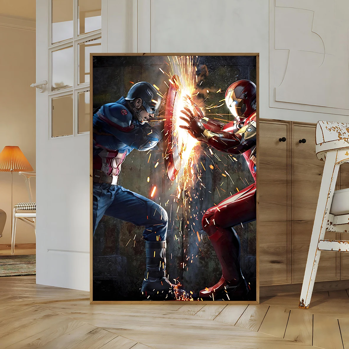 This high-quality print vividly captures the raw intensity of the film’s climax: the iconic Captain America vs Iron Man showdown. The artwork is explosive, depicting the very moment Steve Rogers’ vibranium shield clashes with Tony Stark’s repulsor blast. Sparks fly in a brilliant, chaotic display of light and energy, illuminating the grit and determination on both heroes’ faces. The composition is dynamic, conveying the immense power and emotional weight of their struggle. The cool, determined blues of Captain America’s suit contrast sharply with the fiery reds and golds of Iron Man’s armor, creating a visual representation of their ideological divide. Every detail, from the battle damage on their suits to the sheer force of the impact, is rendered with stunning clarity, making you feel as if you are witnessing one of the most heartbreaking battles in comic book movie history firsthand.