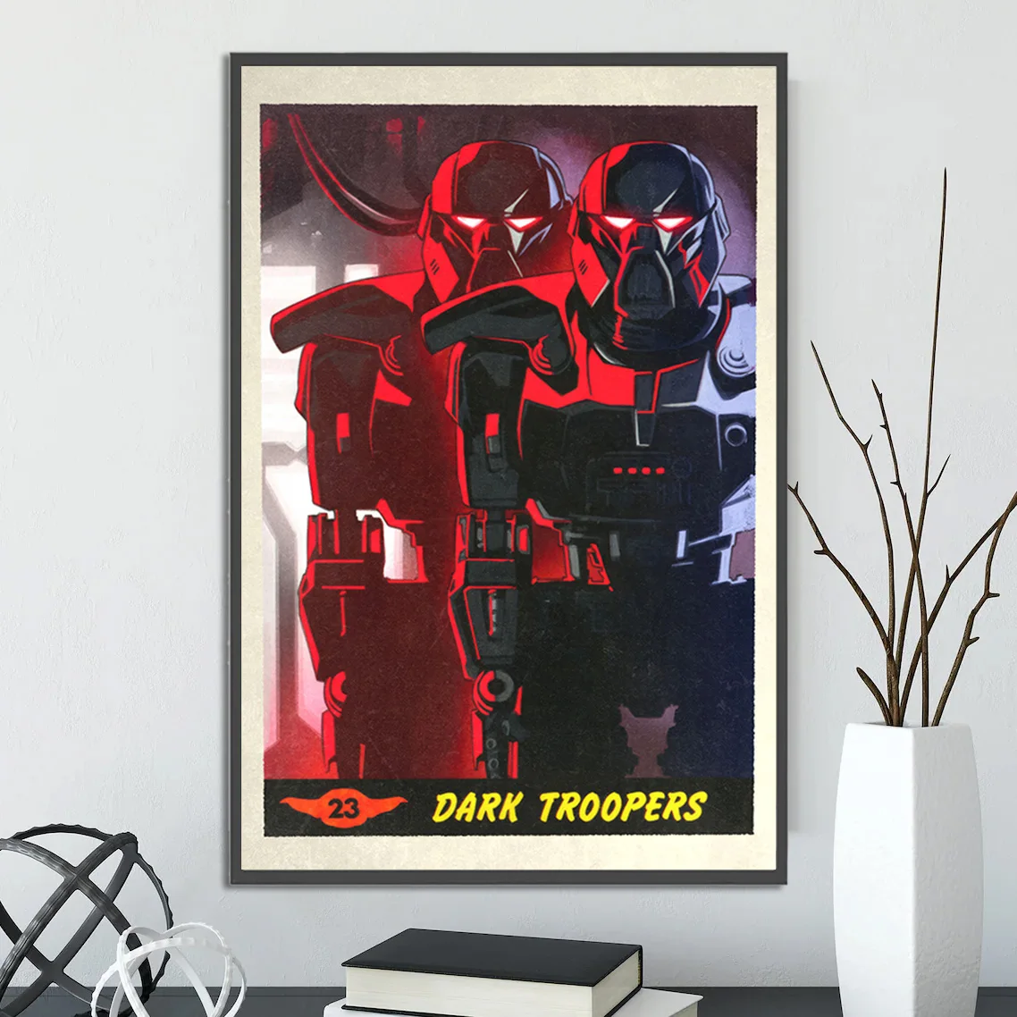 This art print is a visual masterpiece, capturing two Imperial Dark Troopers in stunning, stylized detail. The artist has masterfully used a palette of deep blacks and menacing reds to highlight the glowing crimson eyes that peer from within each Dark Trooper helmet. The composition is powerful, with the droids standing shoulder-to-shoulder, exuding an aura of invincibility. The retro, collectible-card aesthetic adds a unique layer of nostalgia and style, making it feel like a rare artifact from the Star Wars galaxy itself. The textured background and bold “DARK TROOPERS” title at the bottom complete the design, creating a piece of wall art that is both artistically compelling and deeply rooted in the Star Wars Dark Troopers universe. Every line and shadow has been meticulously crafted to showcase the intricate details of their formidable armor, making it a definitive piece for any collector.