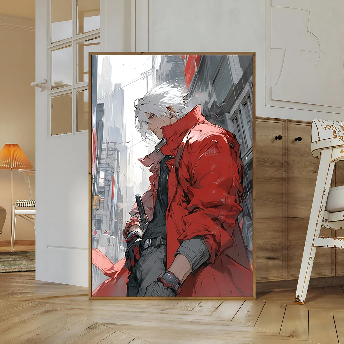 This exceptional print brings the legendary Son of Sparda to life with breathtaking artistic detail. The artwork portrays a character instantly recognizable as Dante Devil May Cry, captured in a moment of quiet intensity against a sprawling, modern cityscape. His signature white hair is windswept, and his iconic red coat billows around him, rendered with a dynamic, painterly quality that emphasizes movement and power. The art style is a masterful blend of gritty urban realism and sharp anime aesthetics, perfectly reflecting the tone of DMC 5. The determined look on his face and the casual yet ready posture, with his hand resting near his sword, speak volumes about his confidence and demon-slaying prowess. The cool color palette of the background makes the vibrant red of his coat pop, drawing the eye and making this a commanding centerpiece for any room. It’s a sophisticated and stylish interpretation that honors the character’s long and storied history.