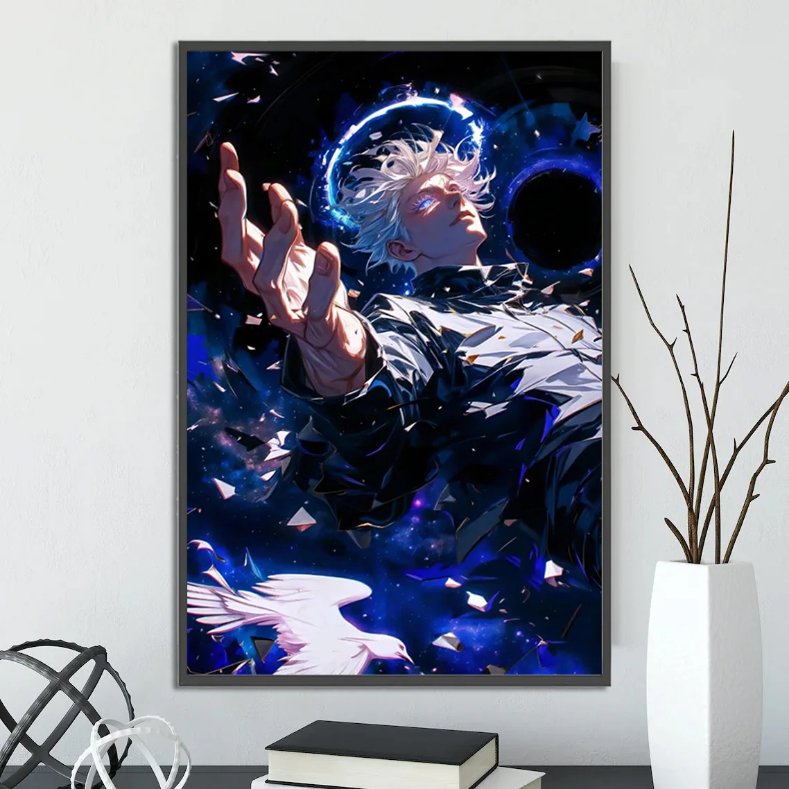 This stunning Gojo Satoru painting is a masterclass in visual storytelling. The artwork depicts Gojo in a transcendent state, floating amidst a cosmic vortex of shattered space, his hand outstretched as if to warp reality itself. A divine halo of blue energy encircles his head, illuminating his signature white hair and piercing blue eyes, which hold an expression of calm superiority. Below him, a white dove soars, a symbol of peace in stark contrast to the chaotic power emanating from Gojo. The deep blues and purples of the background create a celestial atmosphere, making this Gojo Satoru fan art poster feel like a sacred text for the modern anime fan. Every brushstroke and color choice in this Jujutsu Kaisen Gojo Satoru art print is deliberate, designed to draw the viewer in and showcase the character’s immense power. It is a perfect example of high-quality manga wall art that bridges the gap between fan appreciation and fine art.