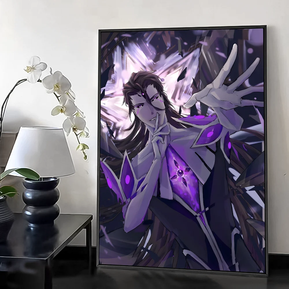 This stunning print captures Aizen Bleach in a moment of transcendent power. The artwork focuses on his evolution, showcasing the Hōgyoku embedded in his chest, radiating a brilliant, corrupting purple energy that shatters the very space around him. His expression is one of calm, arrogant confidence, a subtle smirk playing on his lips as if he is activating Kyōka Suigetsu to ensnare the viewer. The dynamic composition, with shards of reality flying outwards, creates a sense of immense, uncontrollable power. The color palette is dominated by deep blacks and vibrant purples, reflecting his corrupted yet divine state. Every line and shadow is meticulously crafted to highlight the sleek, otherworldly design of his final form, making this a definitive piece for any collector.