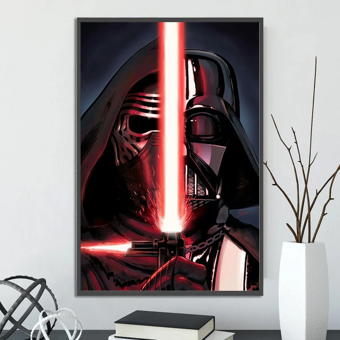 This incredible print captures a powerful moment of convergence, blending the iconic imagery of Darth Vader with the tormented visage of Kylo Ren. The artwork is rendered in a dramatic, high-contrast style, with deep shadows and brilliant highlights that emphasize the raw emotion and menace of the characters. The focal point is the incandescent glow of their red lightsabers, a symbol of Sith power and a testament to the allure of a custom lightsaber. The crimson blade bisects the image, illuminating the intricate details of both masks—Vader’s classic, fearsome helmet and Kylo’s fractured, battle-scarred faceplate. The intense red light reflects off their armor, creating a palpable sense of energy and danger. This is not just a picture, but a carefully composed piece of art that tells a story of lineage, conflict, and the undeniable pull of the dark side.