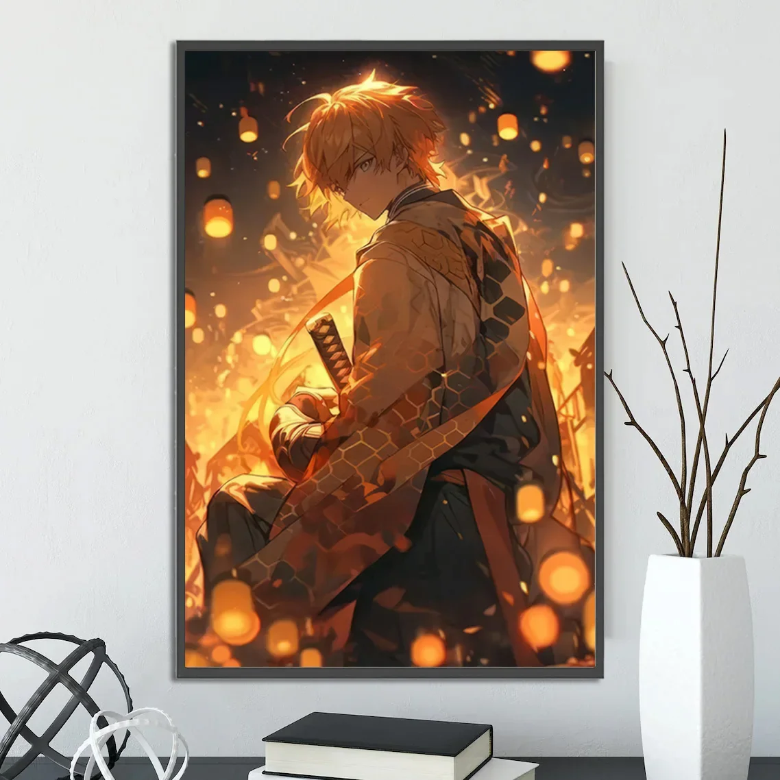 This captivating print beautifully portrays Zenitsu Agatsuma in a rare moment of serene focus, his hand resting on his Nichirin Sword. The artwork is bathed in a warm, golden glow from the surrounding lanterns, creating a dramatic interplay of light and shadow that highlights the intricate details of his iconic yellow and orange haori. The art style is a direct homage to the renowned Ufotable animation, capturing the same depth, vibrancy, and cinematic quality that makes fans ask where to watch Demon Slayer just to witness the spectacle. You can almost feel the crackle of static electricity in the air, hinting at the immense power of the Thunder Breathing style he has mastered. The rich colors and dynamic composition make this print a true statement piece, drawing the eye and sparking conversation among fellow fans of the elite Demon Slayer Corps and their fight against the forces of darkness.